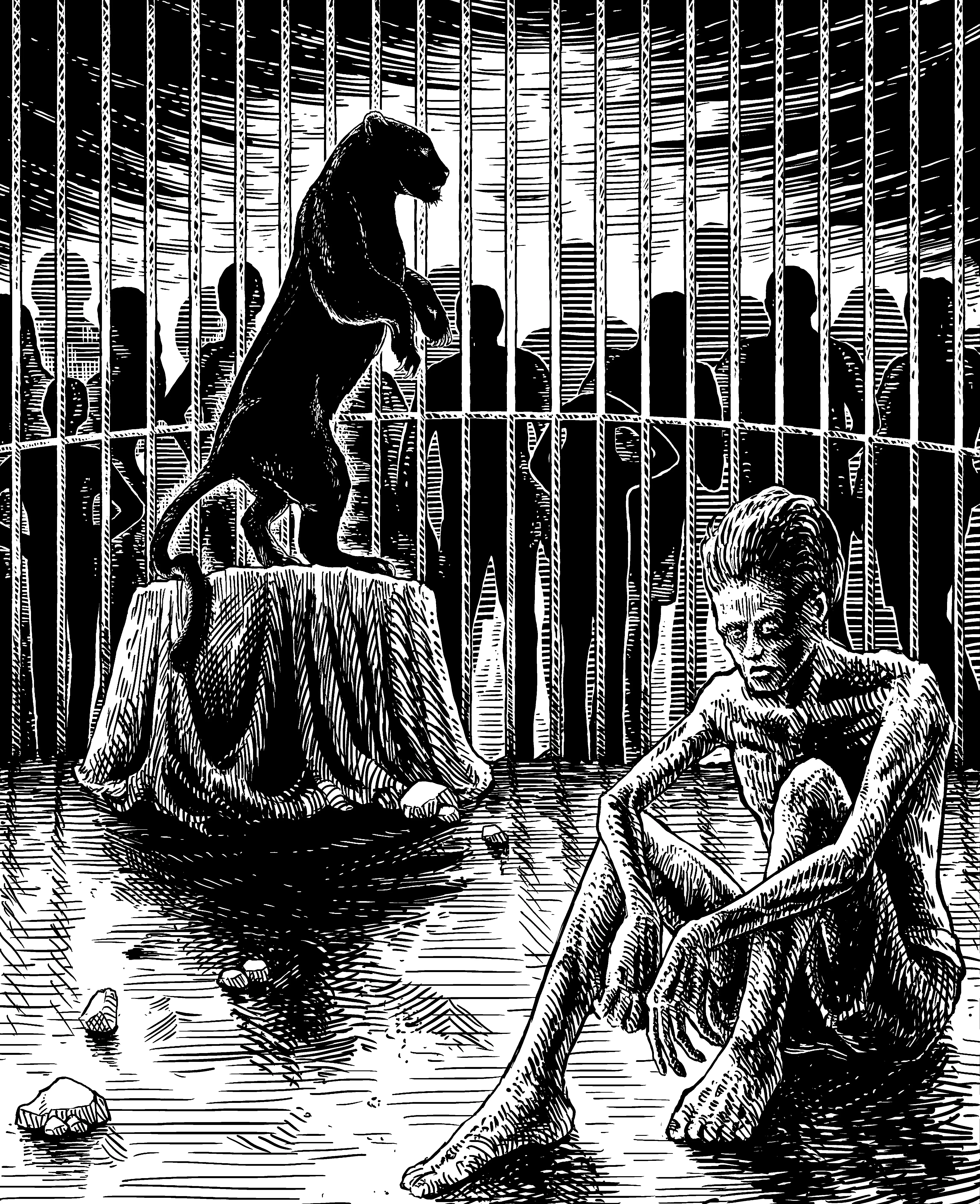 Sometimes he overcame his weakness and sang during the time they were observing, for as long as he could keep it up, to show people how unjust their suspicions about him were. But that was little help. For then they just wondered among themselves about his skill at being able to eat even while singing. He much preferred the observers who sat down right against the bars and, not satisfied with the dim backlighting of the room, illuminated him with electric flashlights. The glaring light didn’t bother him in the slightest. Generally he couldn’t sleep at all, and he could always doze under any lighting and at any hour, even in an overcrowded, noisy auditorium. With such observers, he was very happily prepared to spend the entire night without sleeping. He was very pleased to joke with them, to recount stories from his nomadic life and then, in turn, to listen their stories—doing everything just to keep them awake, so that he could keep showing them once again that he had nothing to eat in his cage and that he was fasting as none of them could.