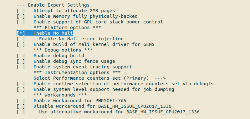 menuconfig 에서 설정해주는 방법은 mali 빌드 설정에서 Enable Expert Settings --> Enable No Mali 옵션을 활성화 해주면 된다.