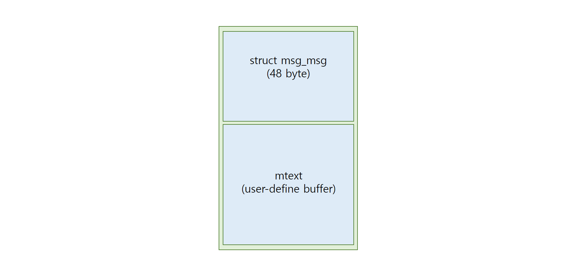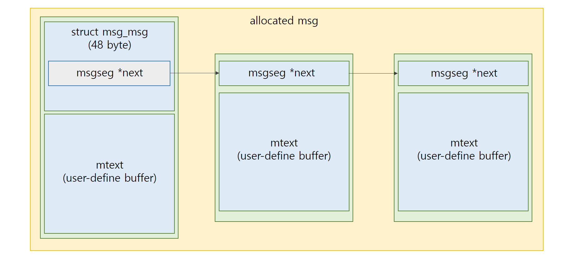 하지만 단지 힙 스프레이만을 통해서 내가 원하는 데이터를 넣는다고 msg_msg를 쓰는게 아니다. 앞서 기술했듯 msgsnd() 함수를 통해 힙에 데이터를 할당 했을 때, 앞의 48바이트는 msg_msg 구조체로 할당이 된다.